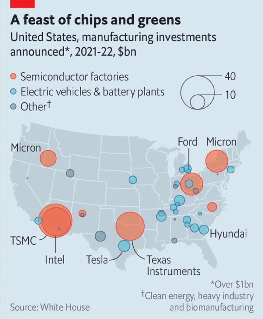 Toà Bạch Cung đưa ra các đầu tư về điện tử tại Hoa Kỳ. Chúng ta không thấy hiện diện ở tiểu bang Cali. Ta thấy tiểu bang Arizona là lớn nhất, cho thấy Silicon Valley hết thời với các chương trình Xanh bú xua la mua. Mấy nhà máy này cần năng lượng mà giá năng lượng ở Cali đắt nhất Hoa Kỳ, và dân Cali rất hãnh diện tham gia cuộc cách mạng xanh khi đi dỗ xăng.Từ khi ông Trump lên, mình thấy nhiều ông thần ả rập tuyên bố sẽ đầu tư vào Hoa Kỳ, gần đây bà thủ tướng Nhật Bản cũng tuyên bố sẽ đầu tư này nọ với những số tiền khủng mà mình không thể đếm hết được hay viết mấy con số ra. Câu hỏi mình đặt ra là lý do phải đầu tư vào Hoa Kỳ thay vì đầu tư vào xứ của họ.