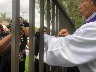 Anh ta gửi cho mấy tấm ảnh tang quyến đứng ngoài hàng rào chào tạm biệt người thân về đấy chúa. Anh ta phải lấy các thánh giá trên quan tài để trao lại cho thân nhân.