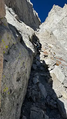 Đường mòn leo lên đỉnh, phải bỏ gậy lại và dùng hai tay để bấu vào các thành đá để leo lên. Sõi đá trợt lắm.Ngồi nghỉ mệt, uống nước để chuẩn bị leo lên. Anh hướng dẫn viên lấy 2 cây gậy của mình, cất tại một nơi, rồi kêu leo lên như trong phim “les canons de Navarrone”. Mình nhìn lên đỉnh thì thất kinh vì cao vời vời, toàn là đá. Đeo mũ bảo hộ và nịt an toàn vào vì khu vực này tuyết tan nên kéo theo sõi đá. Những người leo lên trước đạp đá sõi khơi khơi khiến chúng lăn xuống trúng đầu là cái bốp. Anh ta dặn mình nếu đá trùi rơi xuống mà có người phía dưới thì kêu “rock” báo hiệu cho họ. Có 2 người và một hướng dẫn viên của công ty nào đi cùng lúc với mình. Mình để họ leo lên trước theo tinh thần lội nước theo sau. Nhưng theo tình hình thì không thông minh lắm, nhất là bò lên trước vì đá sẽ lăn xuống. Nhìn bản đồ của ứng dụng Alltrails thì thấy xa đường mòn ghi trong bản đồ, độ mấy chục thước. Hỏi thì hướng dẫn viên kêu là đường kia có nhiều sõi đá nhỏ, leo lên nguy hiểm. Cho nên chỗ tụi này leo lên thì chỉ có 3 người đi trước tụi này độ 20 thước. Chớ không biết cứ đi theo lối kia khá nguy hiểm.